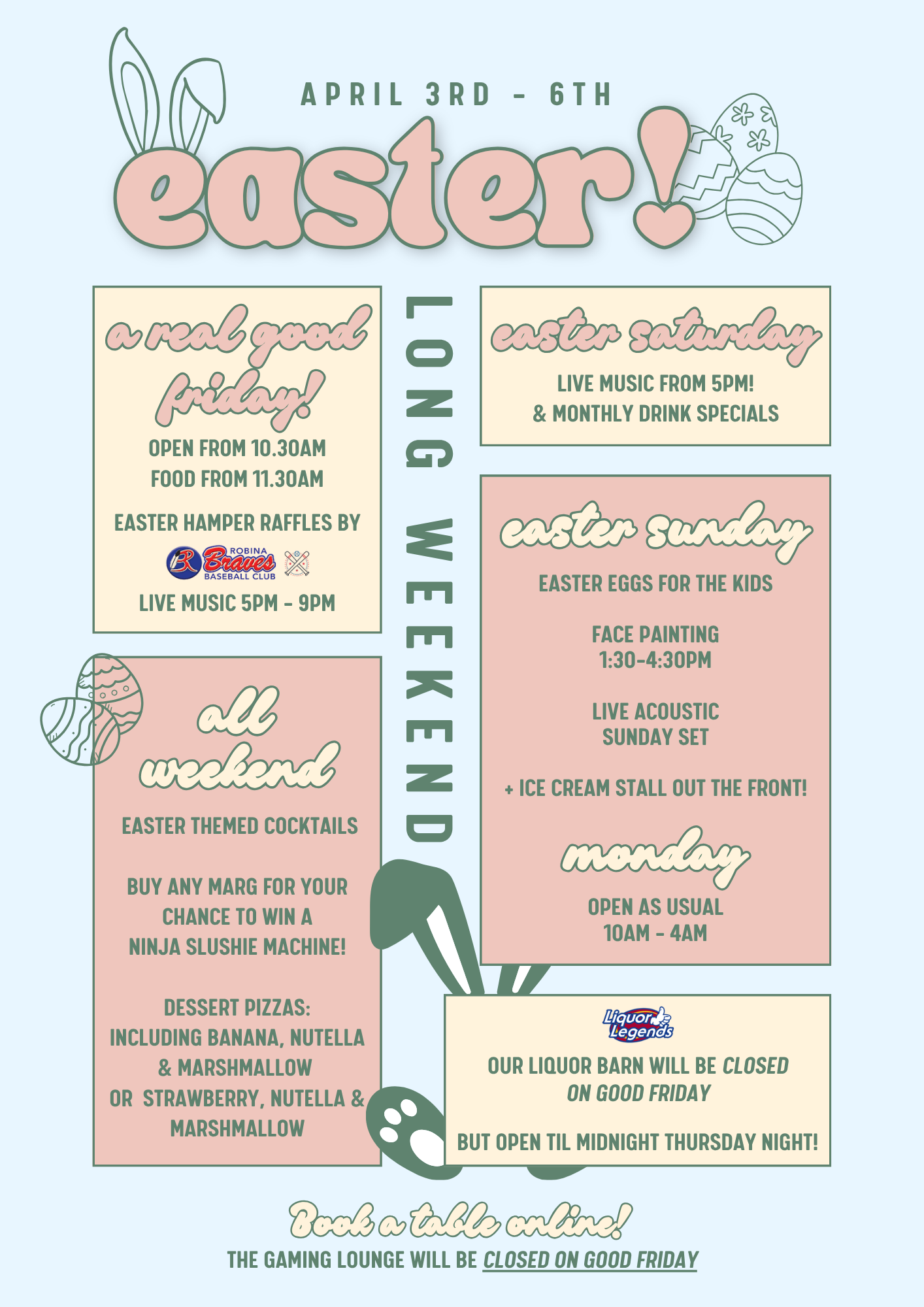 Easter 2026 Friday, April 3, 2026 11:00 AM Monday, April 6, 2026 8:00 PM Google Calendar ICS make a reservation